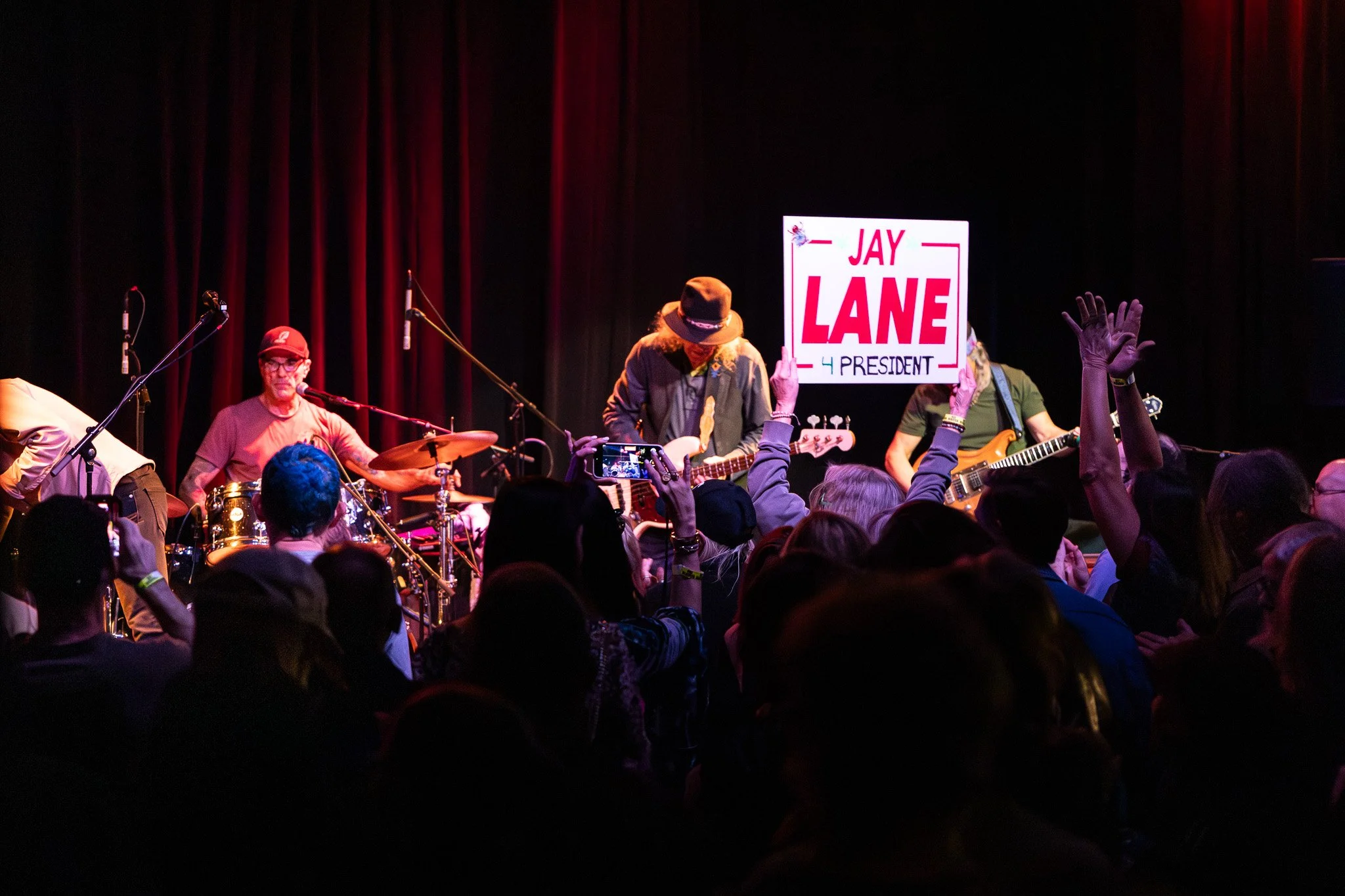 I get the impression that the crowd understands the magnitude of getting to boogy with the Dead-adjacent royalty in front of them tonight - but it also feels like they aren’t phased by that, they’re all so comfortable in this groove. A woman in the front row carries a sign that says JAY LANE 4 and has ‘President’ scrawled on it over top of something else. We learn later that a North Carolina man also named Jay Lane is running for Senate. Jay seems tickled by this in a very non-chalant type of way that only Jay Lane could bring to life.